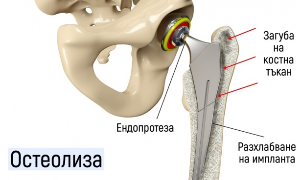 Ендопротезиране - Общоприетото обяснение за остеолизата при смяна на става се свързва с частици отделени от нейното износване. Тъй като тялото се опитва да отстрани тези частици (обикновено състоящи се от пластмаса или метал), това предизвиква автоимунна реакция, която причинява резорбция на костната тъкан. Съобщава се, че остеолизата се появява 12 месеца след имплантирането и обикновено е прогресивна. Това може да изисква ревизионна операция (подмяна на протезата). Въпреки че самата остеолиза е клинично асимптоматична, тя може да доведе до разхлабване на импланта или счупване на костта, което от своя страна причинява сериозни медицински проблеми.