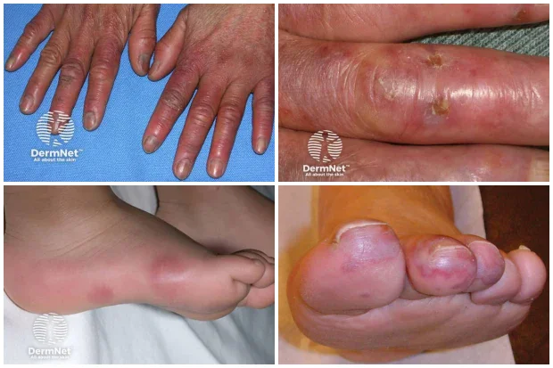 Обикновено околната кожа е еритемовидна и студена. Много често е налице и клинична картина на акроцианоза. Болестните промени на кожата се придружават от парене и болка.