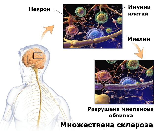 Множествена склероза е заболяване, което причинява разрушаване на обвивката на невроните. Имунната система атакува защитната обвивка- миелин. Това води до затруднена комуникация между отделните неврони и между мозъка и останалата част от тялото. Може да причини изтръпване, слабост, проблеми с ходенето и зрението.