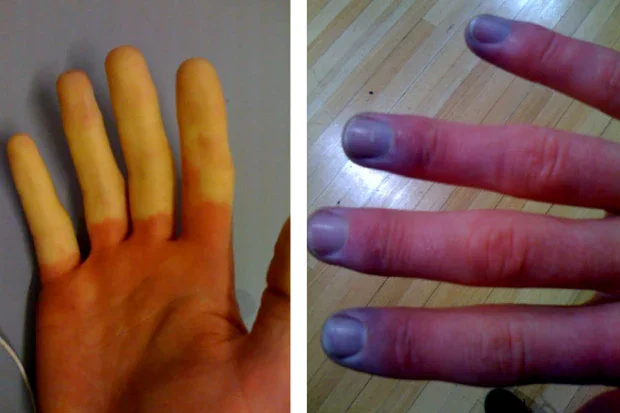 По време на пристъп артериите се стесняват, което нарушава правилната циркулация на кръвта. Пръстите често променят цвета си, преминавайки от бял към син и червен. С приключването на пристъпа и възобновяване на нормалния приток на кръв към ръцете, може да се изпита изтръпване, пулсиране или подуване.